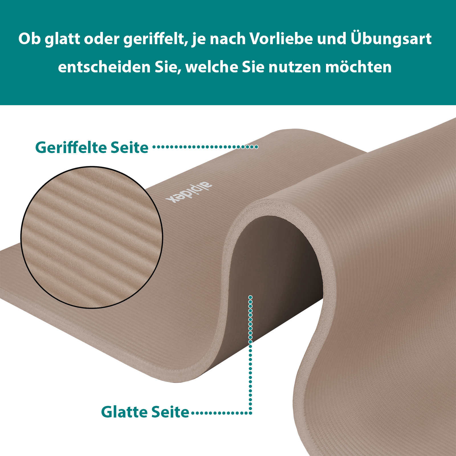 The ribbed surface of this exercise mat not only gives it an attractive design, but also provides additional grip and stability. Even during strenuous workouts, Pilates or pregnancy exercises, you won't slip and will be able to concentrate fully on your activities. Whether smooth or ribbed, you decide which side you want to use depending on your preference and type of exercise. Thanks to the non-slip properties of the rubber, the exercise mat always stays in place on both sides.